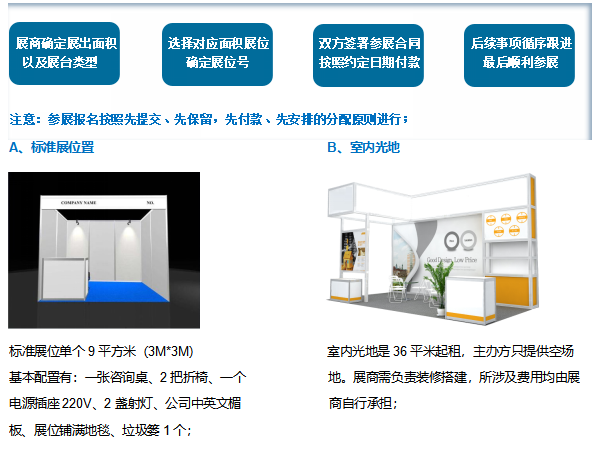 ★ 光地(36 m2起租)配置:展出空场地,搭建费、光地管理费、电源费等费用全部由企业另行支付。